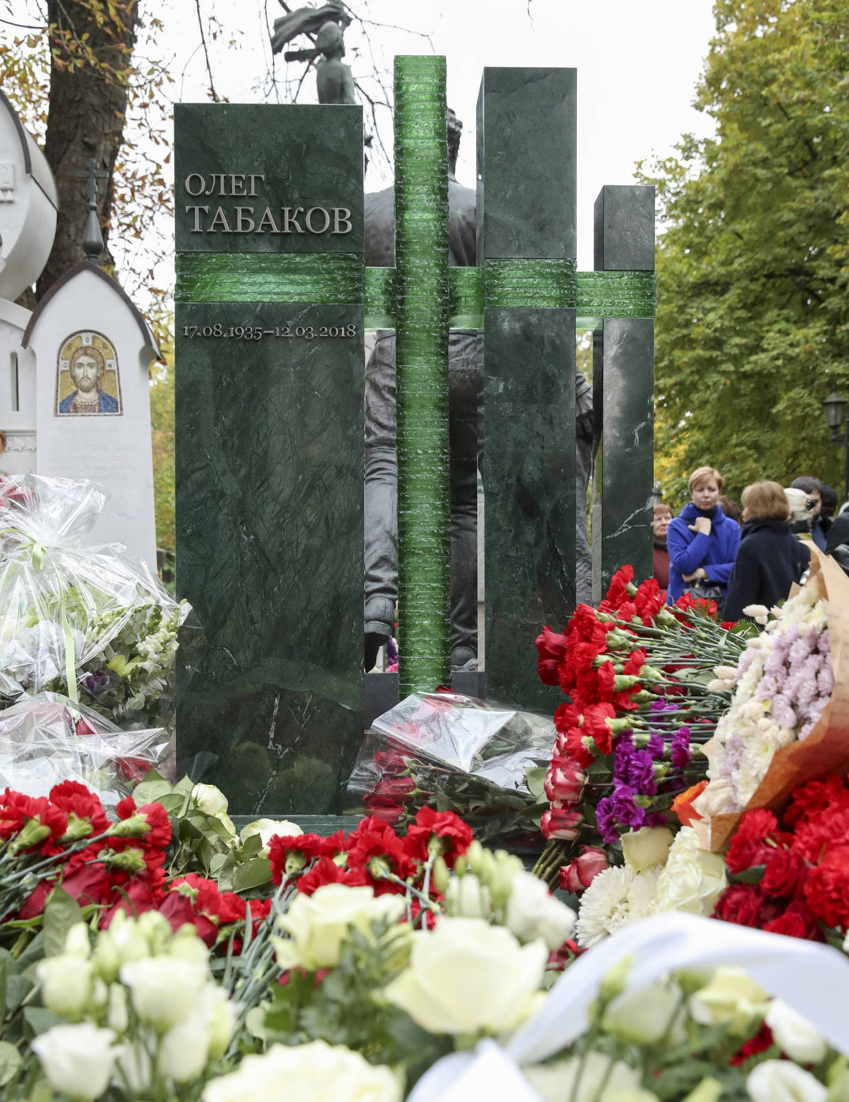 Ранее на могиле Табакова стоял деревянный крест, а сейчас — из зеленого хрусталя. Зудина поблагодарила всех, кто помог ее семье установить достойный монумент. «Хочется сказать спасибо художникам, скульптору. Я ни у кого не просила денег, но два близких друга настояли на том, чтобы я приняла от них средства на этот памятник. Это Сергей Глинка — крестный дочери Марии и Михаил Куснирович. Спасибо за любовь и дружбу! И спасибо театру Табакова за организацию открытия», — отметила 56-летняя Марина Вячеславовна.